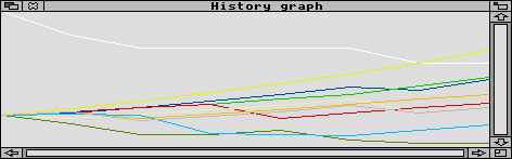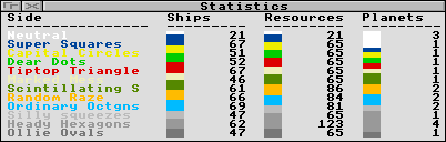 Displays totals of all sides throughout the game so far. Either the totals for Ships, Resources, or Planets can be displayed. The particular variety can be chosen from the windows menu. Note that nothing is shown for the first few turns until a sufficient set of statistics have been collected.
