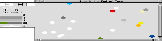 The Trynth galaxy contains a number of planets. Each planet has a resource rating. While under the control of an active side, this will slowly grow after the end of each turn until a maximum is reached. Each turn a number of ships are constructed at each planet depending on the number of resources there. Ships are all alike. For a side to take over another planet they simple send ships there from one or more planets. Once they arrive a battle is fought between all ships present, and the side which is left with ships wins control of the planet. The winner is the first to control 60% of the combined resources and ships totals.