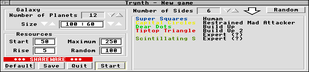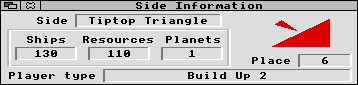 Examining the window, you can change the number of planets. The number of sides may also be changed, within the range of two to thirteen. For each side, an entry will be displayed in the right half of the window. Each side has a name, with associated colour which is used throughout the game. Also a player. This may be either ”Human•, in which case you will direct the efforts of the side. Otherwise one of the army of computer players will take the reins. By player, I mean the style of player. Two or more sides may have ”Human• as a player, this means that two or more human players may play in the game, each with a separate side to direct. If this is the case remember your sides name, and colour before you start. The same applies to the computer players. Just because two sides may be controlled the an ”Expert• player, they are entirely separate with respect to controlling the sides. To change the player for a side, click over the entry to cycle through the available players.